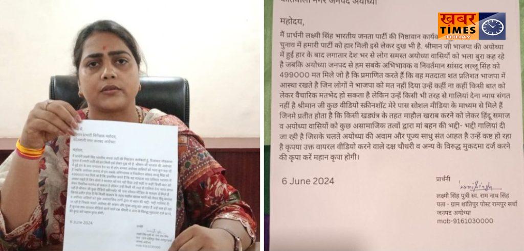 अयोध्या। अयोध्या में भाजपा की हार पर अयोध्यावासियों पर अभद्र टिप्पणी के मामलें पर भाजपा नेत्री लक्ष्मी सिंह ने कोतवाली नगर में अभद्र टिप्पणी करने वालों के खिलाफ तहरीर दी है। गाजियाबाद निवासी दक्ष चौधरी के खिलाफ मुकदमा दर्ज करने की तहरीर दी गई है। अयोध्या के मतदाताओं पर अभद्र टिप्पणी के आरोप पर मुकदमा दर्ज करने की तहरीर दी गई है। लक्ष्मी सिंह के मुताबिक भाजपा प्रत्याशी को चार लाख 99 हजार वोट मिले है। यह सभी अयोध्यावासी है जिन्होंने बीजेपी को वोट दिए है। जिन्होंने बीजेपी को वोट नहीं दिया उनके वैचारिक मतभेद जरूर हो सकते है। लेकिन उन्हें गालियां देना न्याय संगत नहीं है। लक्ष्मी सिंह ने सोशल मीडिया पर चल रहे स्क्रीनशॉट को पुलिस के समक्ष पेश किया है। जिसके आधार पर तहरीर दी गई है।वही शिकायतकर्ता बीजेपी नेत्री का कहना है की फैजाबाद लोकसभा में अयोध्या से बीजेपी ने जीत दर्ज की है। लेकिन 3 अन्य विधानसभा और बाराबंकी की एक विधानसभा से बीजेपी की हार हुई है। जो लोग अयोध्या के लोगो को अभद्र टिप्पणी कर रहे है , वही अयोध्या के संतो पर भी अभद्र टिप्पणी कर रहे है। जो निंदनीय है। इससे आहत होकर नगर कोतवाली अयोध्या में तहरीर दी है।रामायण में वर्णित है की भगवान राम ने कहा था की अयोध्या के लोग उनको बहुत प्रिय है , ऐसे में जो राम के प्रिय है , उनको कैसे कोई अभद्र टिप्पणी कर सकता है।जो लोग अयोध्या के लोगो पर अभद्र टिप्पणी कर रहे है , वह राम भक्त नहीं हो सकते है।